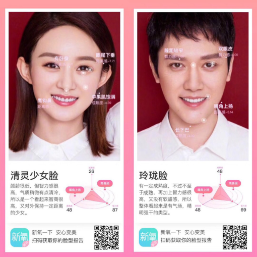 以最近甜蜜官宣的赵丽颖、冯绍峰为例,新氧魔镜测评赵丽颖的脸为清灵少女脸,气质清冷、智商很高,饱满的苹果肌降低了4.39分的成熟度,完美的卧蚕降低了7.71分的距离感;测评冯绍峰的脸为玲珑脸,精明强干、气场十足,较窄的瞳距提高了6分的智力感,长长的下巴增加了4.39分的成熟度,脸型报告十分详尽。
